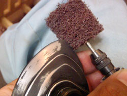 結局ペーパーでやることをあきらめ、スポンジ研磨剤のピットをルーターにセットし、削り落としましたが、これもなかなか作業がはかどりません。