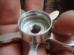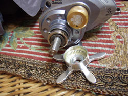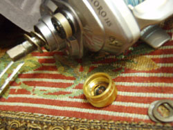 と、ここで、メインのC4はハンドルシャフトが右ネジだったことに気づき、サブのC4の左ネジにフィティングしてみました。しかし、入ることは入るんですが、でかすぎてメカニカルネジに干渉します!