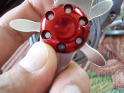 仕上げは力の入りやすいほうで思いっきり締めます。ナット内部のゴムパッキンがハンドルプレートとグイグイ吸着するような感じで、かなり強く締め付けれます。ガタつきは一切ありません。リテーナーが付いてないので、この締め付けトルクで補っているそうです。リテーナーをつけない理由は、ハンドル回転軸に対しての重量バランスを理想の50:50にするためだそうです。また、特殊形状にしたネジ穴も、よりトルクをかけた締め込みができるようにと考えて設計されたようです。