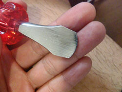 で、最近導入の新兵器。コインドライバーを使って外しました。リブレとかサーペントとかのノブキャップは10円玉であけるんですが、10円だけに小さくて回しにくいんですよね。で、探してみたら、コインドライバーなるものがあって、やはり、コインを使うネジのドライバーとして売っているんです。これはタカギのコインドライバーで安かったです。たしか500円くらい。