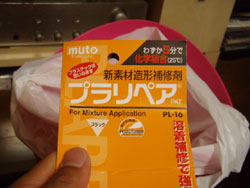 次の作戦。シリコンを使います。2液です。配合比は重量比で100:1。シーラントとかの1液でやった場合は、内部が固まらないので型は取れません。カタ取る時は、必ず2液シリコンを使う必要ありです。ちなみに、粘性が低く、硬化後の硬さが硬いほど精密な型が取れます。