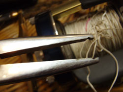 ほぐしていくと、やがて、赤丸のような部分が出てきます。チチワの真ん中にラインが通っているところです。ラインを引っ張ろうとしてもチチワがひっかかり、止まる。ゆえにラインが出なくなる。これがバックラです。で、このチチワからラインの先端を抜きます。