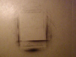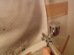 で、まずは@の条件で、いったん頓挫した墨汁ですが、墨汁の素晴らしいところってのはのくところ。水性塗料っていったって、硬化したら油性1液塗料と一緒。耐水性でのきません。ところが墨汁は違う。硬化したところで、バスマジックリンつけてタワシでこすったら一撃wエアブラシはミクロの霧が広範囲に散らばるので作業中は気にしなくても、終わって紙を剥がしてみると、こんな風に紙のマスキング跡が付いていたってのが日常。広範囲を一気に簡単に掃除できないことには風呂場でのエアブラシは不可能です。