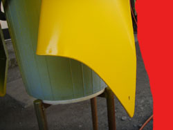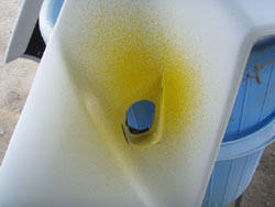 で、塗る塗料ですが、ベースコート(いわゆる色つき塗料)を1液ポリエステル塗料。トップコートを2液ウレタンという感じでやることにしました。従来は、ベースコートも2液ウレタン。トップコートも2液ウレタンでしたが、両方2液ウレタンをt使った場合、完全硬化に時間がかかるので、2度塗り3度塗りの手間がかかるのと、硬化剤で使うイソシアネートが毒劇物で、廃棄のコストアップ&混ぜたが最後、使い切らないと余っても固まってしまってコストアップ。というわけで、最近は1液塗料をベースコートに使うのが主流になりつつあるようです。このポリエステル塗料は、2液ウレタンと相性がよく、アクリルの上に塗ったときのような層面剥離が起きないようです。