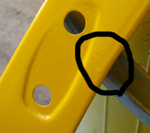 なんと、トップコートのウレタンにボルトの皿がめりこんじゅう!やっぱり、補修用の2液ウレタンは、新車のウレタンに比べたら塗膜が弱いんかなぁ・・・。