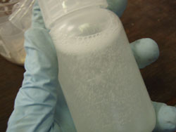 まずは、説明書どおり、塗料50、薄め液50で配合してみました。すると、薄すぎてたれるたれる。これは塗れたもんでありません。