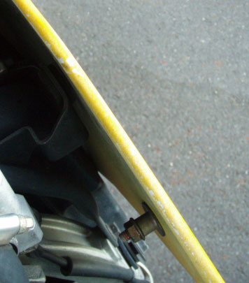 サイドカウルのハシ。面ではなく、線であるため、塗料がどうしても乗らない。そのためはげています。トップコートもマトモに乗っておらず、指で引っかくとペリペリはげます。タッチアップしたほうがいいんかな(汗)