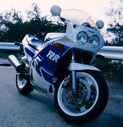 87年型FZR750のドノーマル。レプリカ黄金時代の幕開けとなったバイクです。バリバリ伝説のグンのライバルのヤマハワークスライダーが乗っていたバイクの750版。1000は750のボアアップバージョンで、125馬力で、ゼロヨン10秒台をたたき出し、当時最高時速280km。当時世界最速。