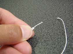 ライターで炙ったところを足の親指で押さえ、切断したループを両手で結っていきます。大久保さんは合掌をしてコヨリを作るようにやっていましたが、そのやり方では全くうまい具合に出来ず。やはり両手でテンションをかけながらグルグルと回していったほうが無難です。