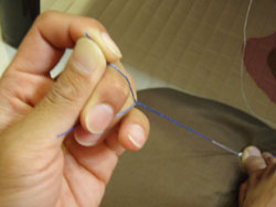 ヨリのてっぺんを左手でつまんで、ヨリが戻らないようにとめて、