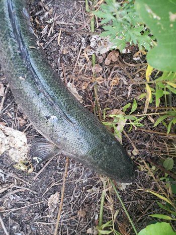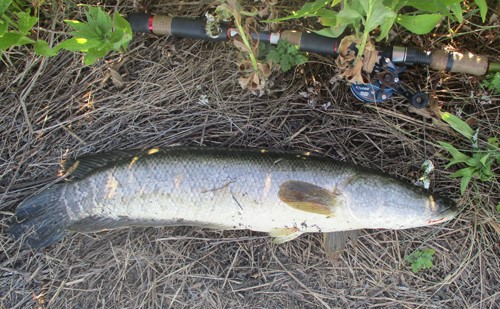 帰っているとちょっと張り出たブッシュにどえらいでかい雷魚が!