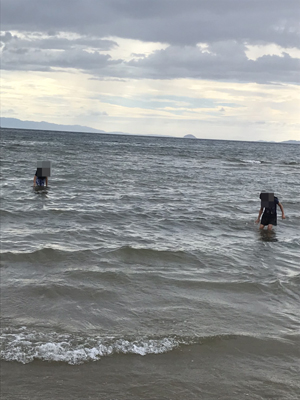 シャローは浅すぎて魚が入っておらず、沖は深くて魚が見えない。