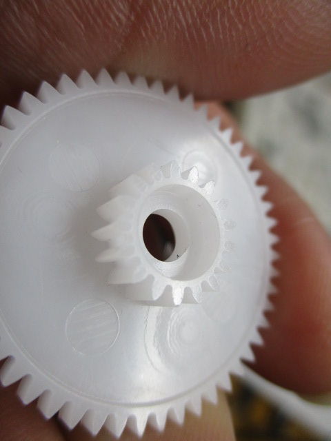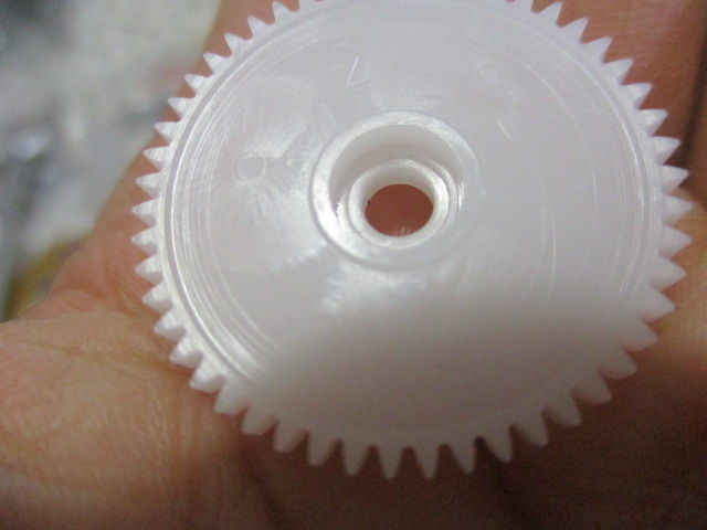このコグ、不思議なことに、下側の大径ギア側の穴は、成形時に付けていると思われ、成形時の金型の跡がついております。