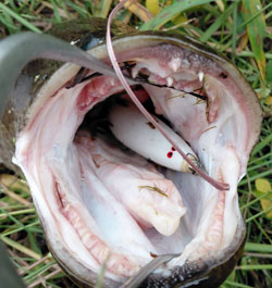となったかと思うと、雷魚が下にもぐり、根にへばりついたようになって動かない!